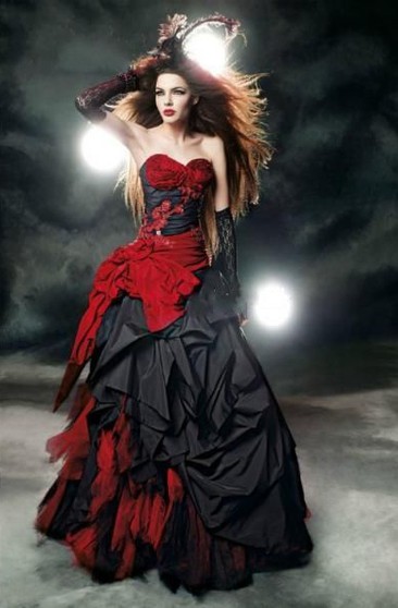 The skirt is created with a high low hem in red taffeta hand made flowers and dripping black organza ribbons. We offer the largest gothic collection in the nation. Let wedding dress fantasy design a custom wedding dress with your ideas and specifications.