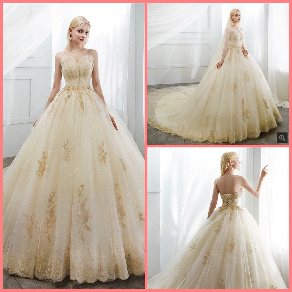 Robe De Mariage Ball Gown Gold Lace Appliques Wedding Dress
