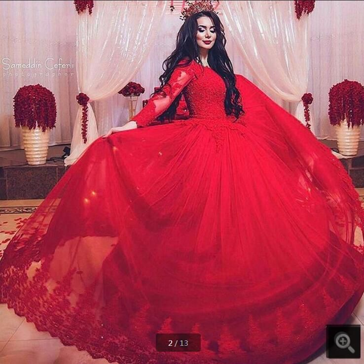 Red Ball Gown Long Sleeves Tulle Wedding Dresses With Color Non