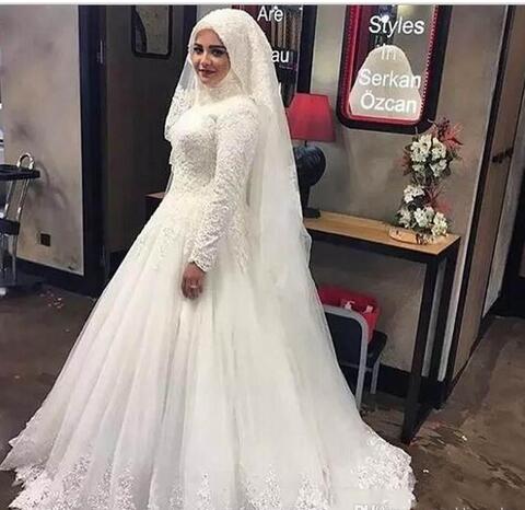 Lace High Neck Muslim Wedding Dresses 2018 With Long Sleeve Floor