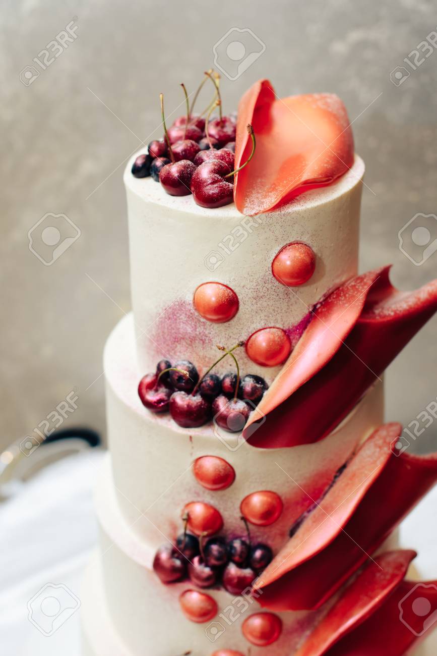 Beautiful Big Three Story Cherry Colored Wedding Cake Stock Photo